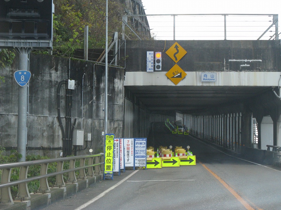 | 久しぶりに糸魚川より市振寄りに来ているので、「急行2号」は親不知辺りで撮影しようと、国道8号を走っていたら、 片側交互通行になっていた。 足繁く通った2022(令和04)年頃もこの区間では片側交互通行をやっていて、 1回の赤信号が数分と長いもんだから追っかけの撮りテツのクルマが苛立って、 信号が変わったらバカみたいに飛ばしたり煽ってきたりすることがあったね。 2025/11現在、最大7分待ちで片側交互通行しているから、急ぐ撮りテツは北陸道を使いなさい。 |