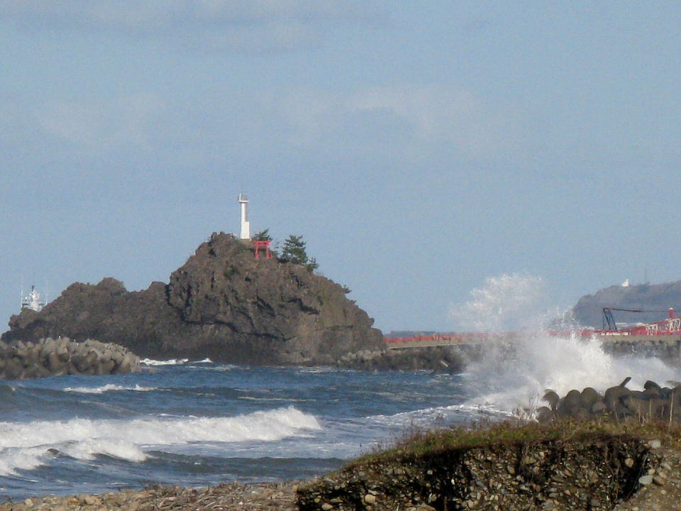 | 親不知で「急行2号」を撮影したら、そろそろ帰信(信州へ帰ること)方向にする。 国道8号で糸魚川市街を抜けて直江津方面に向かう。 途中、能生の弁天岩の辺りで、大きな波がテトラで砕ける様子を撮影。 |