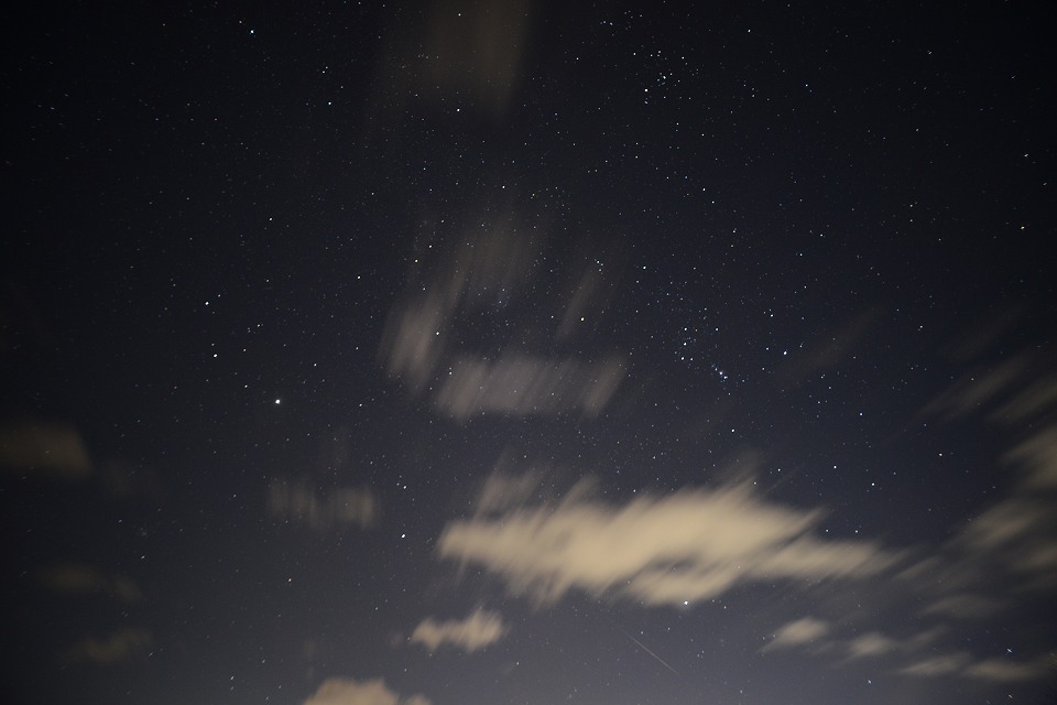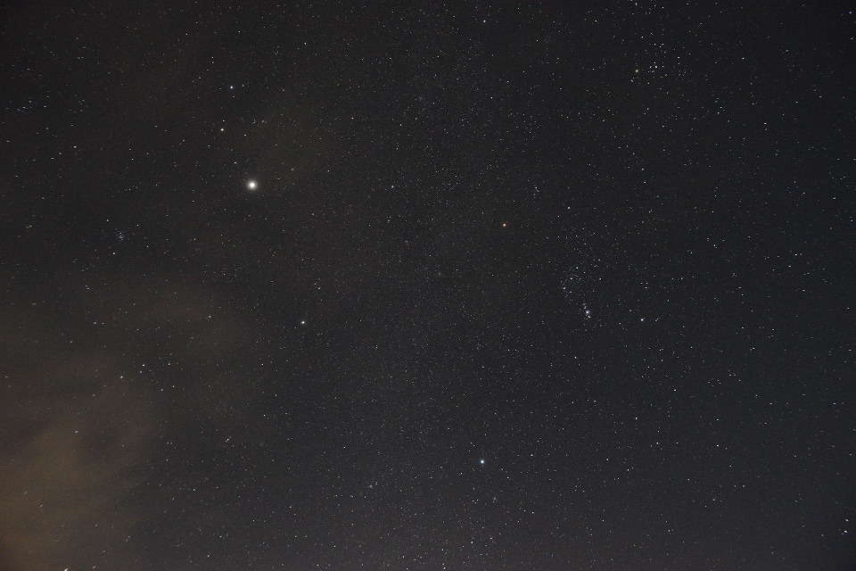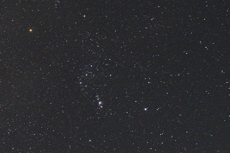 | ということで、1枚上の写真から流れ星に部分をトリミングしたもの。 トリミングのみで、拡大はしていないよ。 写真中央のちょっと上に少し斜めにスッと光跡があるでしょ。 ちなみに、写真左上の赤っぽい星は、オリオン座の「ベテルギウス」というバカでっかい星。 この撮影の後、道の駅で軽く「車宿」(=車中泊)した。 |