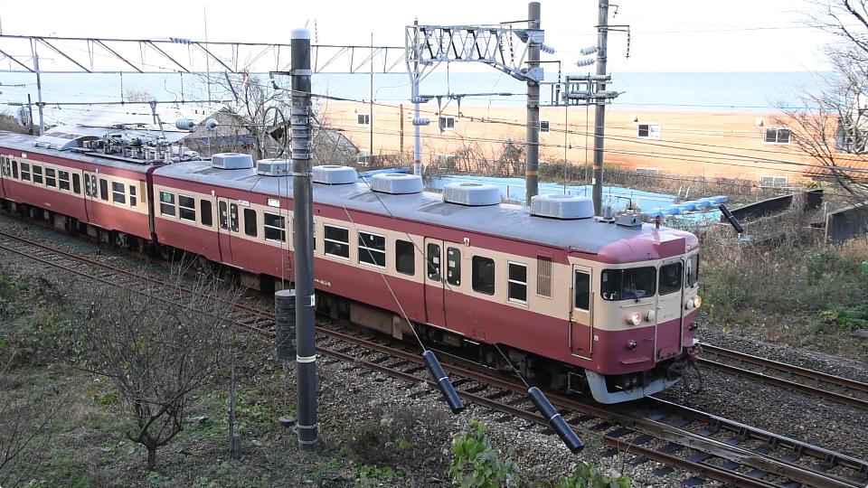 | 市振で折り返して「急行2号」で直江津に向かう。 糸魚川を発車したところでデッドセクションの案内があった。 その案内と、デッドセクション通過で照明がいったん消える様子の約2分10秒の動画はこちら。 |