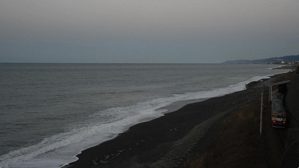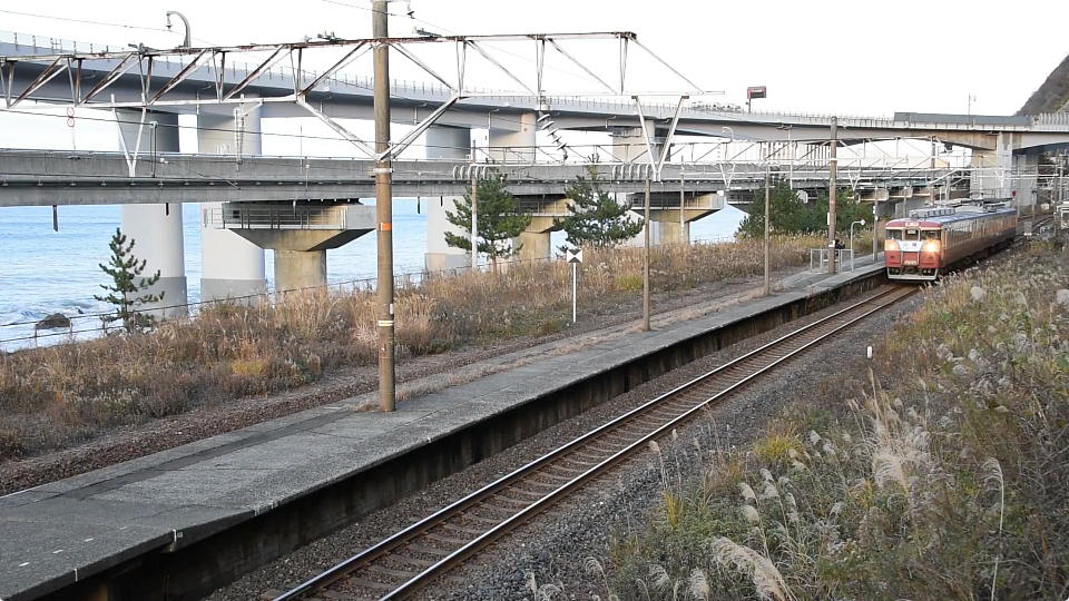 | だいぶ暗くなってきての「急行4号」は、寂しい日本海と・・・と思ってスタンバっていたら、 電車がいきなりやって来たので、アタマが欠けていますが、ま~い~や(笑)。 約9秒の動画はこちら。 |