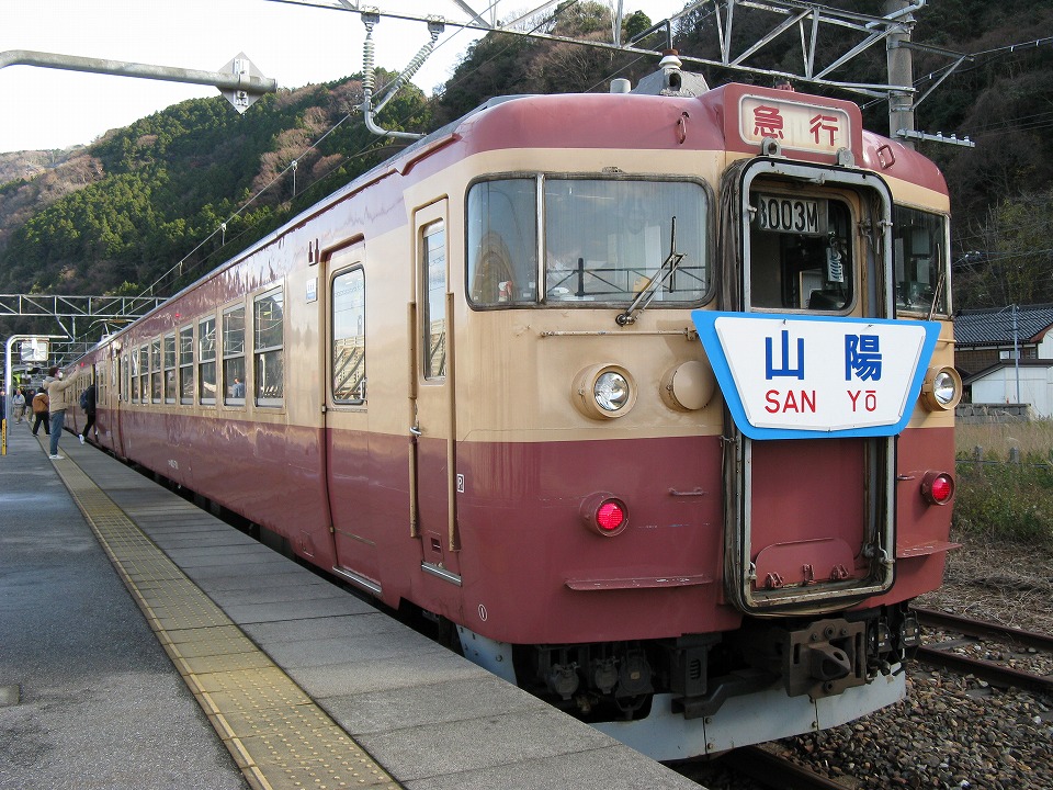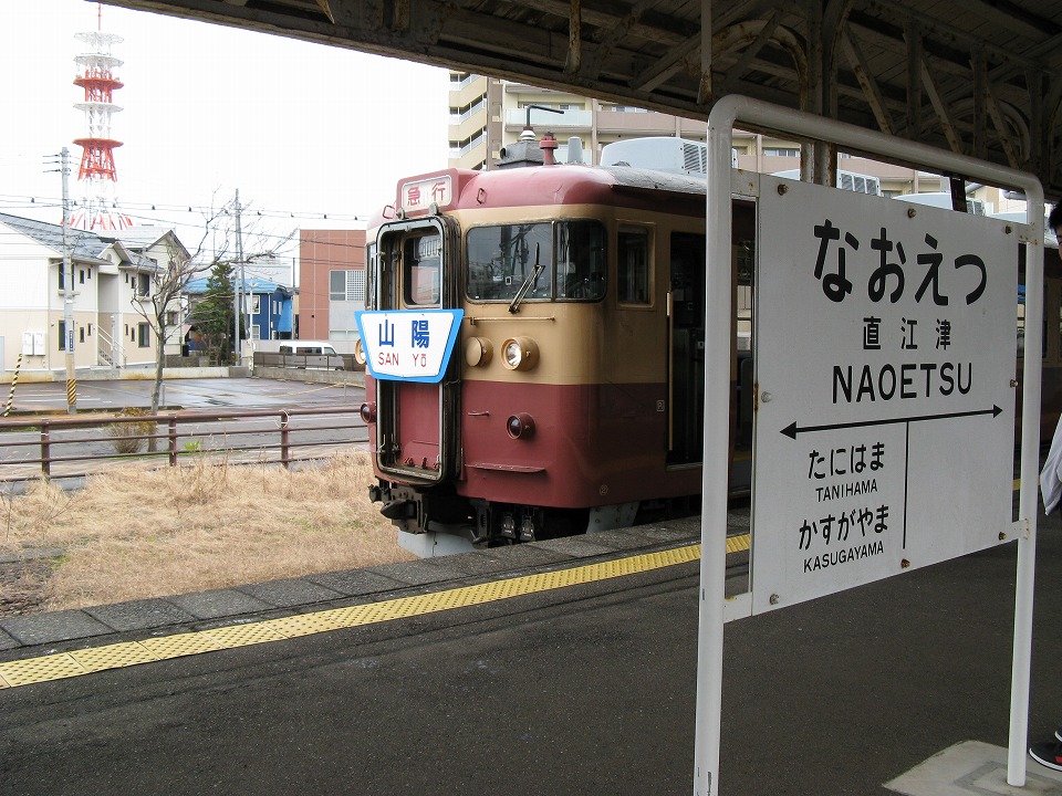 | 急行「山陽」は、山陽新幹線博多開業前にちょうど尾道に住んでいた俺にとっては。 岡山~広島・下関の153系湘南色の急行というイメージだが、1968(昭和43)年頃、広島~博多で運転されていた?(詳しくは確認していません。)。 それが、直江津で(笑)。 って、あれ?「山陽」? ウェブサイトでの案内は、今日は「玄海」じゃなかったっけ? ま~い~けど。 |