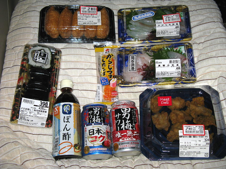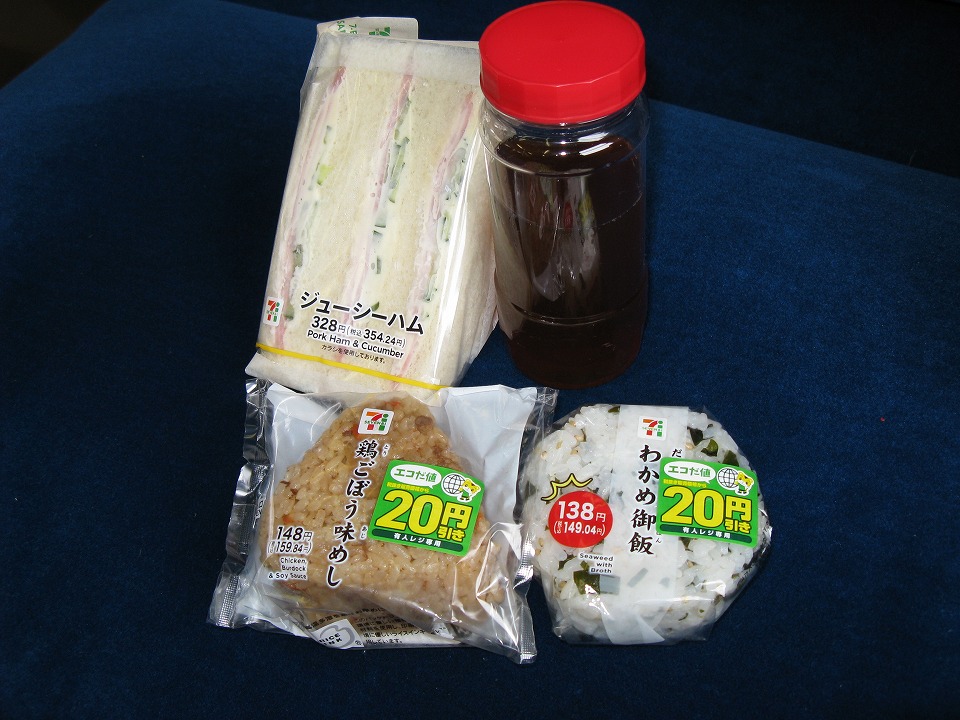 | 能生停車中にお昼になったので、昼メシ。 焼酎のミニペットボトルの中身は麦茶だよ。 |