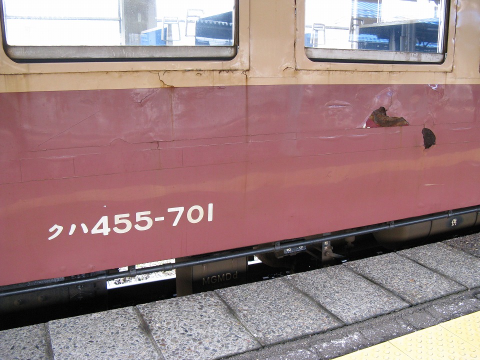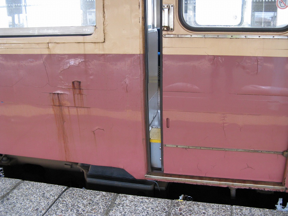 | 以前のページでも「車体の塗装の傷み」について書いたのだが、その声が届いたのか(届くワケないだろ。)再塗装することになった。 しか~し、再塗装はなんと「新北陸色」で行うという、俺にとっては気持ちが思いっきり萎える内容だった。 でもさ、このクルマが北陸で走っていたときは「新北陸色」だったんだから、しかたないといえばしかたないのかもしれない。 そしてきっと、そのまま引退しちゃうんだろうなという気がする。 |