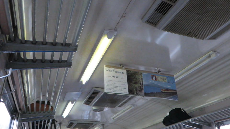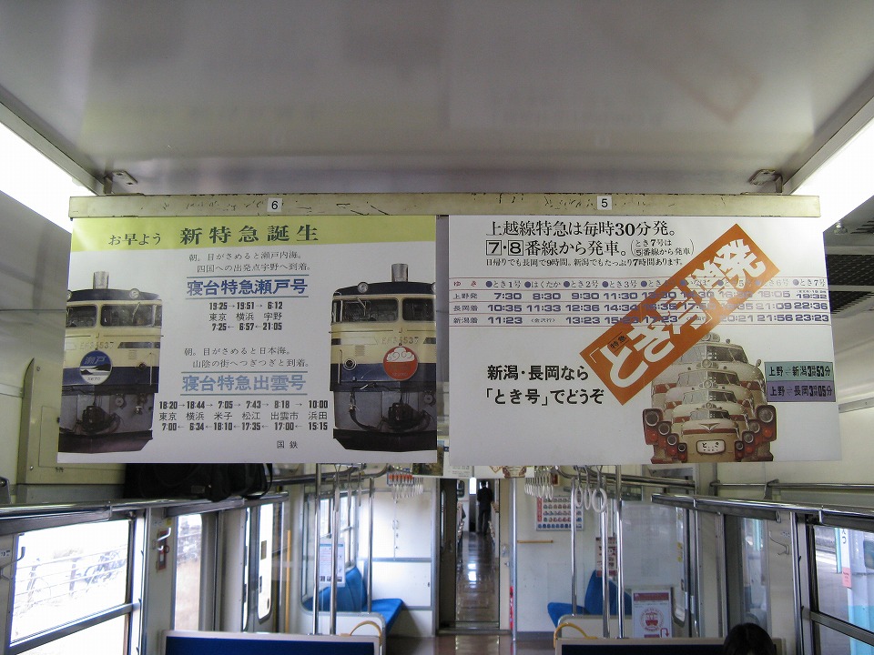 | 「急行」の車内には、昔の車内吊りポスターがいろいろとぶら下がっている。 |