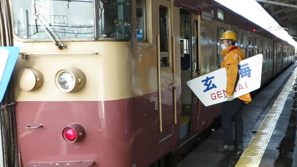 | 「山陽」のヘッドマークは間違いだったようで、直江津で「玄海」に交換されることになった。 乗客数名が「急行1号」の乗務員に指摘したり問い合わせたりして、トキ鉄の"確認不足"が分かったみたい。 |