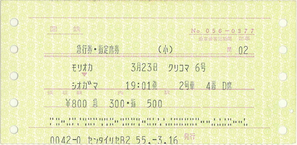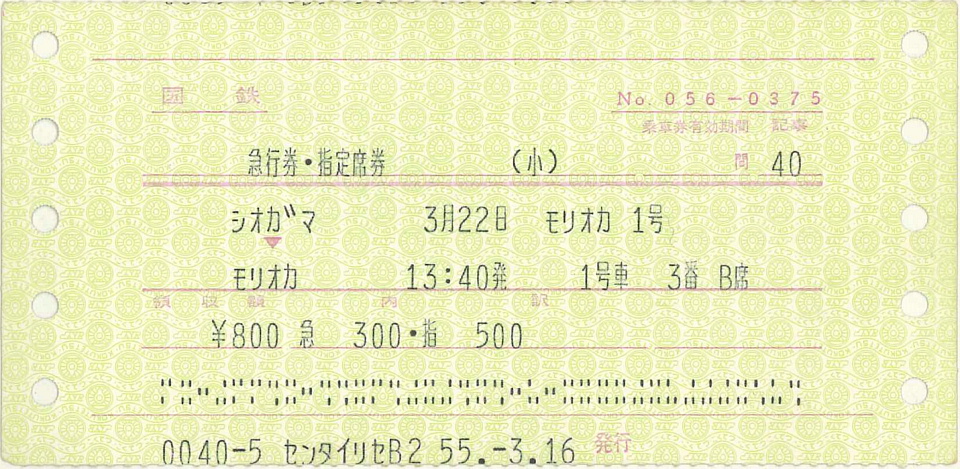 | 目次のページで、"俺にとって急行といえば「くりこま1号」"と書いたが、 「きっぷはあったっけかな?」と思い、収集箱をひっくり返してみたら 1980(昭和55)年3月のを見つけた。 しかし、列車は、盛岡への行きが「もりおか1号」で、帰りが翌日の「くりこま6号」だった。 この写真のこども用の他にも、親(おそらく今は亡きおふくろ。)用の大人のきっぷも連番で残っていた。 この年の3月末に名古屋に引っ越しているので、 今は亡きオヤジの転勤が決まり、おふくろの実家の盛岡から遠くなることから、 たった1泊だけど盛岡に挨拶がてら遊びに行ったんじゃないかと推測する。 いつもなら朝の「くりこま1号」なのだが、これは昼過ぎの「もりおか1号」だ。 この日は土曜日なので、俺が小学校から帰ってきてからの出発に設定したんじゃないかと思う (当時は土曜日は午前に授業があったし、時期的にもしかしたら終業式?)。 興味深いのは、発行所が仙台駅旅行センターであること。 発行日の3月16日は日曜日なので、オヤジと仙台に遊びに行ったときに買ったんじゃないかと思うが、 みどりの窓口ではなく、なんで旅行センターだったんだろう。今となってはもう分からない。 ただ、この盛岡往復の急行券の他にも、同じ日に発行された 仙台~上野の寝台急行「新星」と、東京~名古屋の「ひかり」のきっぷもあったので、 まとめて買ったんだということは確認できた。 ※急行「もりおか」は、ネット情報によれば、453系だ、455系だといろいろあったが、 俺にとっては「交直流急行色」の電車であれば、ど~でもいい(笑)。 結局、何回も乗った「くりこま1号」のきっぷはなかったので、盛岡駅で素直に駅員に渡していたんだろうね。 |