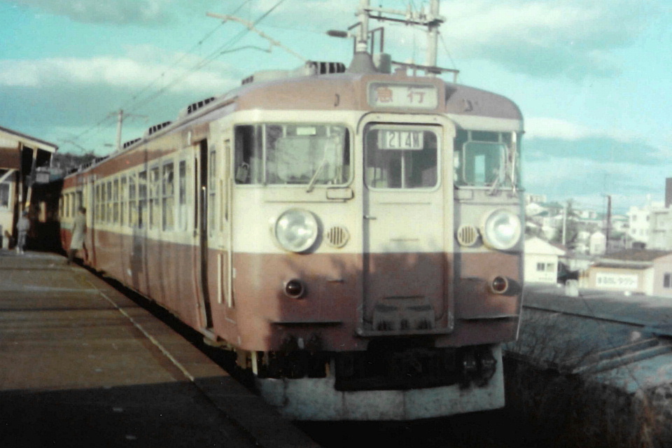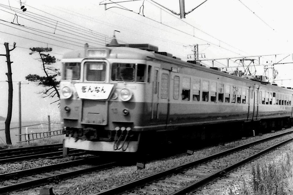 | 【後日追加】 アニキが撮影したネガが出てきて、その中に455系のコマがいくつかあったので、 いったん紙焼きにして、それをスキャンした。 この写真は、下り「第1つくし」(201M)でほぼ間違いない。 当時の時刻表で確認してみたら、アニキは列車順の通りに撮影しているのが分かっておもしろかった。 撮影地点は山陽本線の14kp。他のコマで14kpが写っているのがあり、その地点で各列車の先頭やケツを撮影しているので間違いない。 垂水駅から西へ900mほどの地点だ。 当時は神戸市垂水区に住んでいたので、アニキは時々撮影に来ていたと思われる。 なお、先頭車の列車番号表示が「104」になっているのがフシギ。 ※撮影時期について: 列車順どおりに撮影しているこのネガの他のコマに581系「みどり」が写っていることから、 1967(昭和42)年10月~1968(昭和43)年09月なのは間違いない。 非冷房の車両の窓が開いていることから、暖かいか暑い時期と思われる。 そして、午前中から撮影していることがネガのコマから分かるので、日曜日か祝日か夏休みだろう。 そこで、まず、ダイヤ改正直後の1967/10の前半について、気象庁のページで調べてみたら以下のとおりだった。 1967/10/01(日)09:00 22.4℃ 曇り 1967/10/08(日)09:00 18.9℃ 晴れ 1967/10/10(祝)09:00 18.5℃ 曇り一時雨 1967/10/15(日)09:00 18.5℃ 晴れ この記録によれば、窓を開けるほどの気温ではないと思われるので、 この写真の撮影は、翌年の1968(昭和43)年の夏前後とみるのが適切な気がする。 この写真の先頭車は指定席で、1枚下の最後尾は自由席だ。 窓の開き方が大きく違っているが、これは、指定席は空いていて自由席は混んでいるためと思われる。 |
