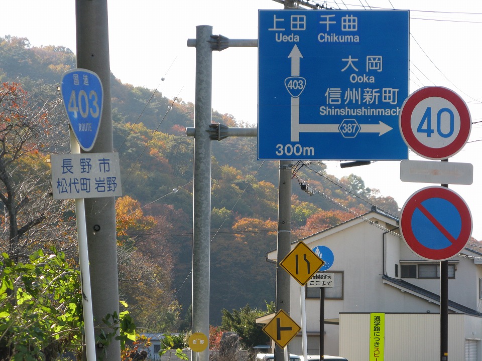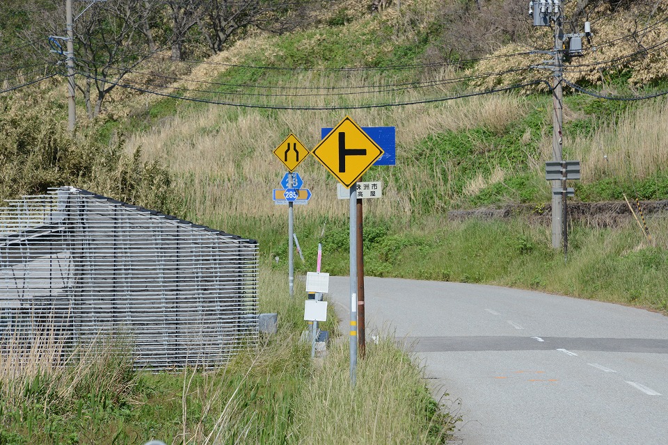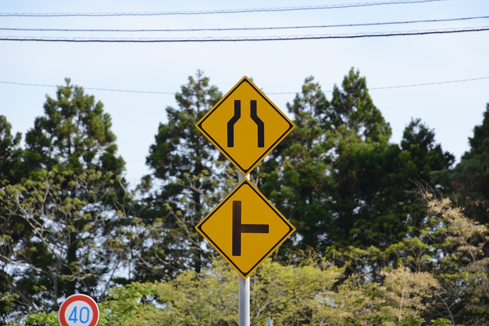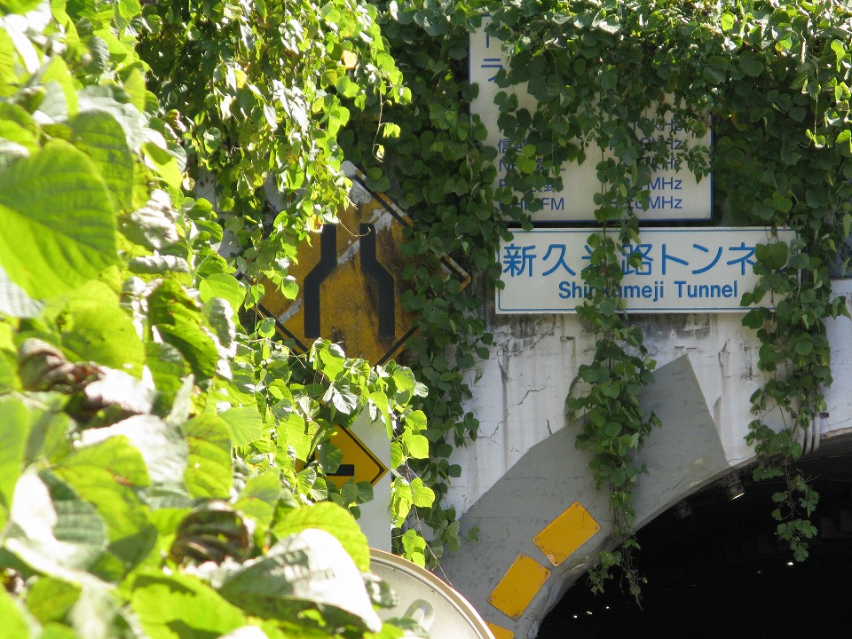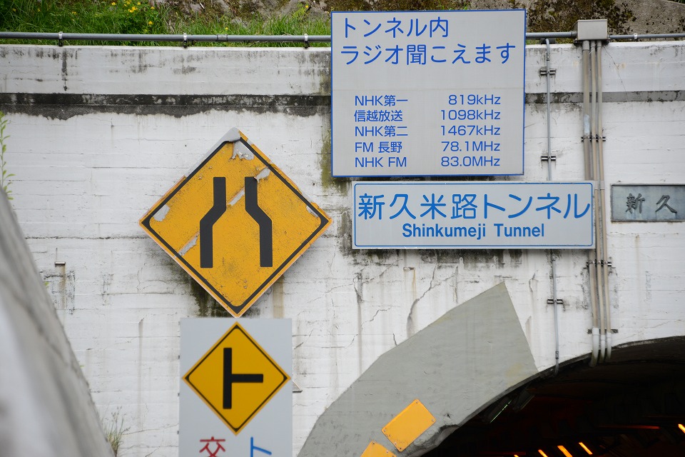 | これは「準々ハト」。 「ハ」はバカでっかいタイプのものが、トンネルの壁面に設置されている。 そして、「ト」は「┣形道路交差点あり」の警戒標識がデザインされた縦型のプレートが、 トンネルの手前の国道19号の脇に立っていて、 トンネルの先に交差点があるから気を付けてね、ということをアピールしている。 この2つを縦に並べると「ハト」っぽく見えるでしょ。「ト」が警戒標識ではないから「準々」(笑)。 2021/05/07:長野市にて |