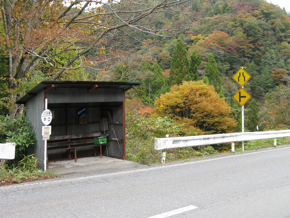 | 「純ハト」。 ストビューで見ると2025/08現在、道路工事でバス停は移設され、"ハト標識"は確認できない。 工事後は戻るんだろうか。 2021/11/01:長野県天龍村にて |